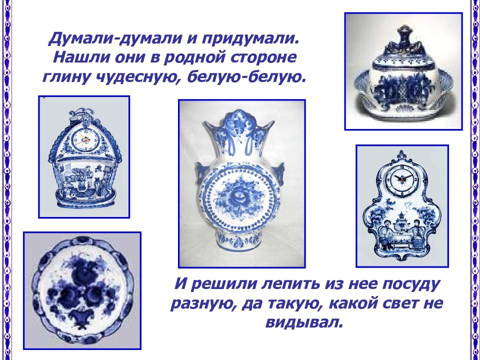 И решили лепить из нее посуду разную, да такую, какой свет не видывал. Думали-думали и придумали. Нашли они в родной стороне глину чудесную, белую-белую.