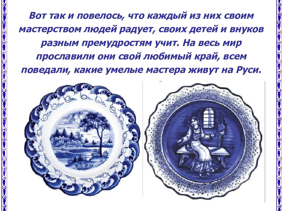 Вот так и повелось, что каждый из них своим мастерством людей радует, своих детей и внуков разным премудростям учит. На весь мир прославили они свой любимый край, всем поведали, какие умелые мастера живут на Руси.