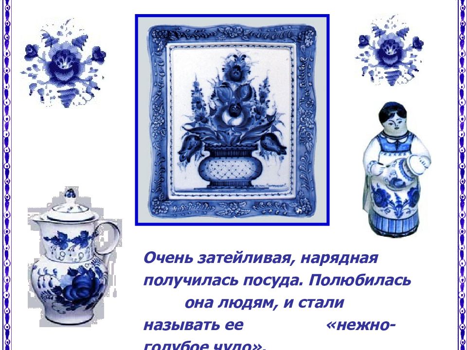Очень затейливая, нарядная получилась посуда. Полюбилась она людям, и стали называть ее « нежно-голубое чудо ».