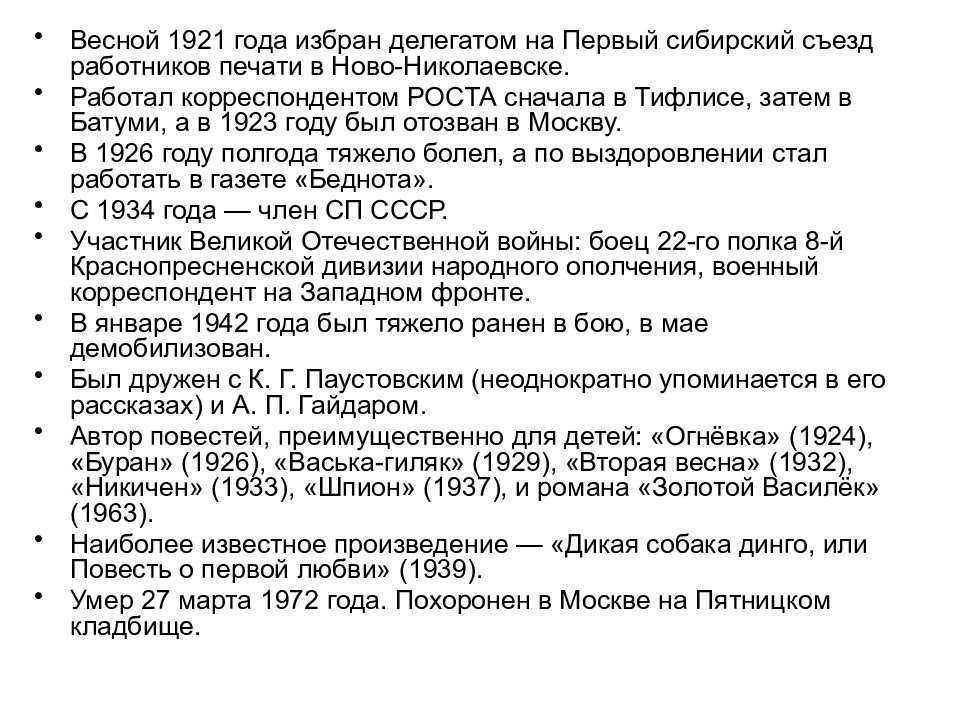 Весной 1921 года избран делегатом на Первый сибирский съезд работников печати в Ново-Николаевске. Работал корреспондентом РОСТА сначала в Тифлисе, затем в Батуми, а в 1923 году был отозван в Москву. В 1926 году полгода тяжело болел, а по выздоровлении стал работать в газете «Беднота». С 1934 года — член СП СССР. Участник Великой Отечественной войны: боец 22-го полка 8-й Краснопресненской дивизии народного ополчения, военный корреспондент на Западном фронте. В январе 1942 года был тяжело ранен в бою, в мае демобилизован. Был дружен с К. Г. Паустовским (неоднократно упоминается в его рассказах) и А. П. Гайдаром. Автор повестей, преимущественно для детей: «Огнёвка» (1924), «Буран» (1926), «Васька-гиляк» (1929), «Вторая весна» (1932), «Никичен» (1933), «Шпион» (1937), и романа «Золотой Василёк» (1963). Наиболее известное произведение — «Дикая собака динго, или Повесть о первой любви» (1939). Умер 27 марта 1972 года. Похоронен в Москве на Пятницком кладбище.
