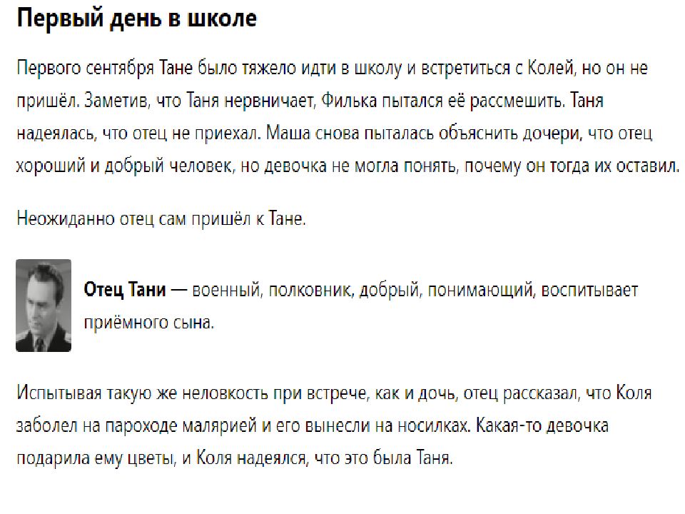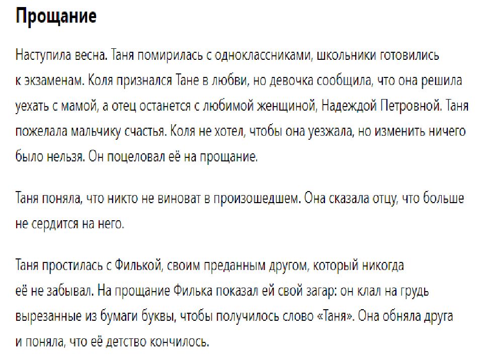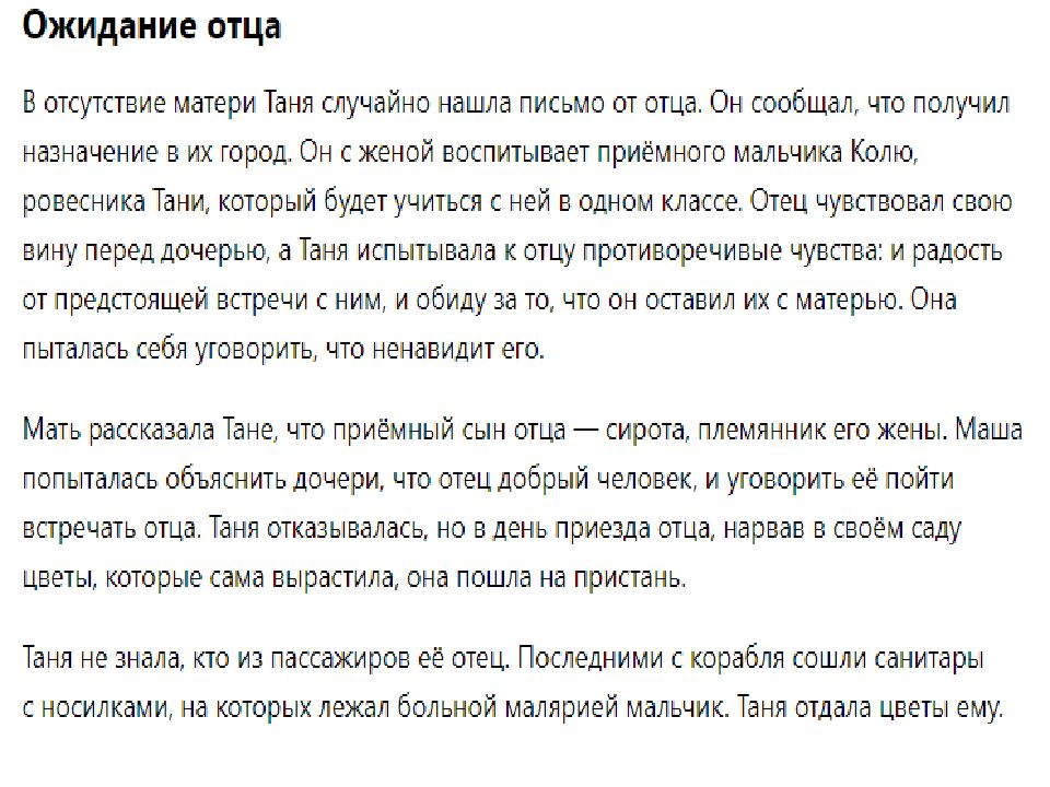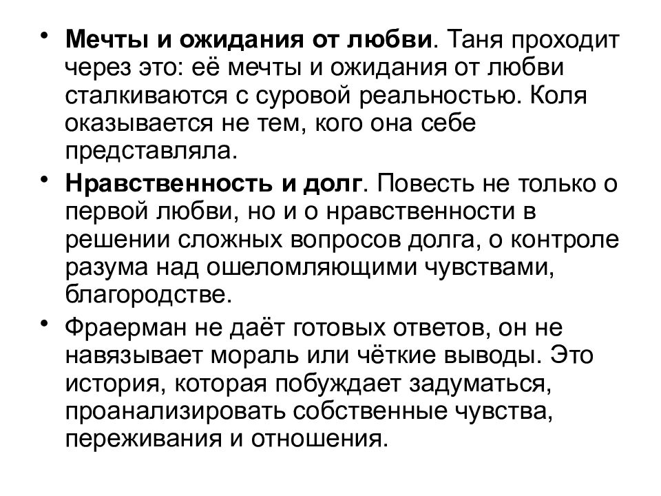 Мечты и ожидания от любви. Таня проходит через это: её мечты и ожидания от любви сталкиваются с суровой реальностью. Коля оказывается не тем, кого она себе представляла. Нравственность и долг. Повесть не только о первой любви, но и о нравственности в решении сложных вопросов долга, о контроле разума над ошеломляющими чувствами, благородстве. Фраерман не даёт готовых ответов, он не навязывает мораль или чёткие выводы. Это история, которая побуждает задуматься, проанализировать собственные чувства, переживания и отношения.