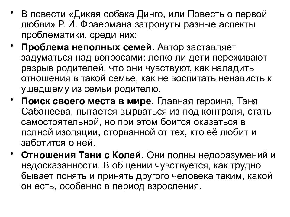 В повести «Дикая собака Динго, или Повесть о первой любви» Р. И. Фраермана затронуты разные аспекты проблематики, среди них: Проблема неполных семей. Автор заставляет задуматься над вопросами: легко ли дети переживают разрыв родителей, что они чувствуют, как наладить отношения в такой семье, как не воспитать ненависть к ушедшему из семьи родителю. Поиск своего места в мире. Главная героиня, Таня Сабанеева, пытается вырваться из-под контроля, стать самостоятельной, но при этом боится оказаться в полной изоляции, оторванной от тех, кто её любит и заботится о ней. Отношения Тани с Колей. Они полны недоразумений и недосказанности. В общении чувствуется, как трудно бывает понять и принять другого человека таким, какой он есть, особенно в период взросления.