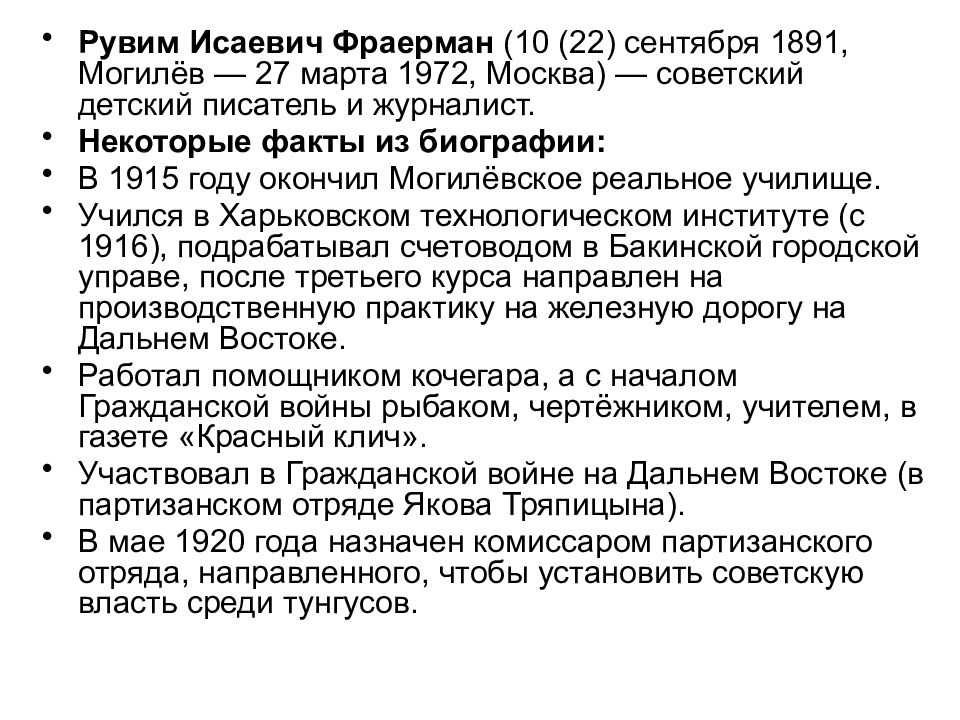 Рувим Исаевич Фраерман (10 (22) сентября 1891, Могилёв — 27 марта 1972, Москва) — советский детский писатель и журналист. Некоторые факты из биографии: В 1915 году окончил Могилёвское реальное училище. Учился в Харьковском технологическом институте (с 1916), подрабатывал счетоводом в Бакинской городской управе, после третьего курса направлен на производственную практику на железную дорогу на Дальнем Востоке. Работал помощником кочегара, а с началом Гражданской войны рыбаком, чертёжником, учителем, в газете «Красный клич». Участвовал в Гражданской войне на Дальнем Востоке (в партизанском отряде Якова Тряпицына). В мае 1920 года назначен комиссаром партизанского отряда, направленного, чтобы установить советскую власть среди тунгусов.