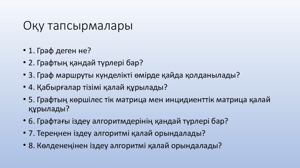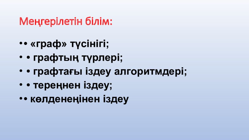 • «граф» түсінігі; • графтың түрлері; • графтағы іздеу алгоритмдері; • тереңнен іздеу; • көлденеңінен іздеу