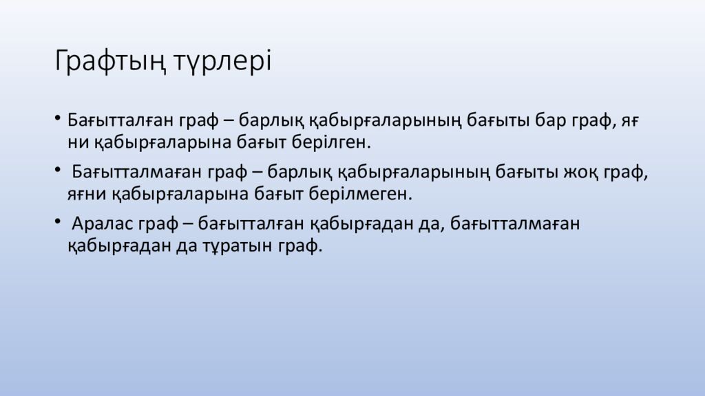 Бағытталған граф – барлық қабырғаларының бағыты бар граф, яғ ни қабырғаларына бағыт берілген. Бағытталмаған граф – барлық қабырғаларының бағыты жоқ граф, яғни қабырғаларына бағыт берілмеген. Аралас граф – бағытталған қабырғадан да, бағытталмаған қабырғадан да тұратын граф.