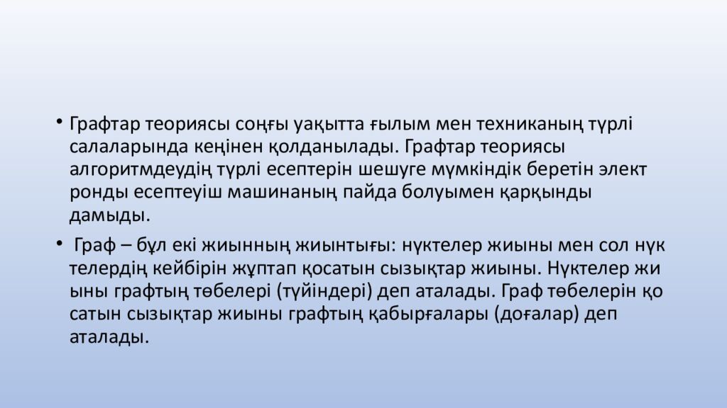 Графтар теориясы соңғы уақытта ғылым мен техниканың түрлі салаларында кеңінен қолданылады. Графтар теориясы алгоритмдеудің түрлі есептерін шешуге мүмкіндік беретін элект ронды есептеуіш машинаның пайда болуымен қарқынды дамыды. Граф – бұл екі жиынның жиынтығы: нүктелер жиыны мен сол нүк телердің кейбірін жұптап қосатын сызықтар жиыны. Нүктелер жи ыны графтың төбелері (түйіндері) деп аталады. Граф төбелерін қо сатын сызықтар жиыны графтың қабырғалары (доғалар) деп аталады.