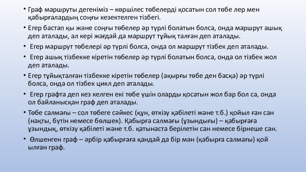 Граф маршруты дегеніміз – көршілес төбелерді қосатын сол төбе лер мен қабырғалардың соңғы кезектелген тізбегі. Егер бастап қы және соңғы төбелер әр түрлі болатын болса, онда маршрут ашық деп аталады, ал кері жағдай да маршрут тұйық талған деп аталады. Егер маршрут төбелері әр түрлі болса, онда ол маршрут тізбек деп аталады. Егер ашық тізбекке кіретін төбелер әр түрлі болатын болса, онда ол тізбек жол деп аталады. Егер тұйықталған тізбекке кіретін төбелер (ақырғы төбе ден басқа) әр түрлі болса, онда ол тізбек цикл деп аталады. Егер графта деп кез келген екі төбе үшін оларды қосатын жол бар бол са, онда ол байланысқан граф деп аталады. Төбе салмағы – сол төбеге сәйкес (құн, өткізу қабілеті және т.б.) қойыл ған сан (нақты, бүтін немесе бөлшек). Қабырға салмағы (ұзындығы) – қабырғаға ұзындық, өткізу қабілеті және т.б. қатынаста берілетін сан немесе бірнеше сан. Өлшенген граф – әрбір қабырғаға қандай да бір мән (қабырға салмағы) қой ылған граф.