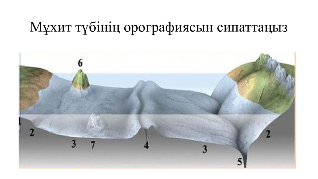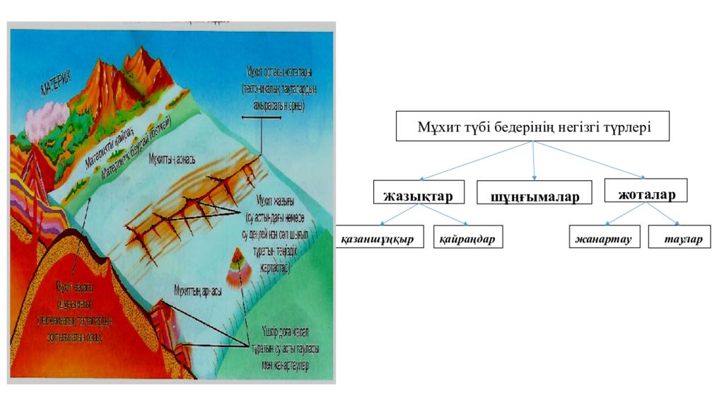 Мұхит түбі бедерінің негізгі түрлері Ж азықтар шұңғымалар жоталар қ азаншұңқыр қайраңдар жанартау таулар