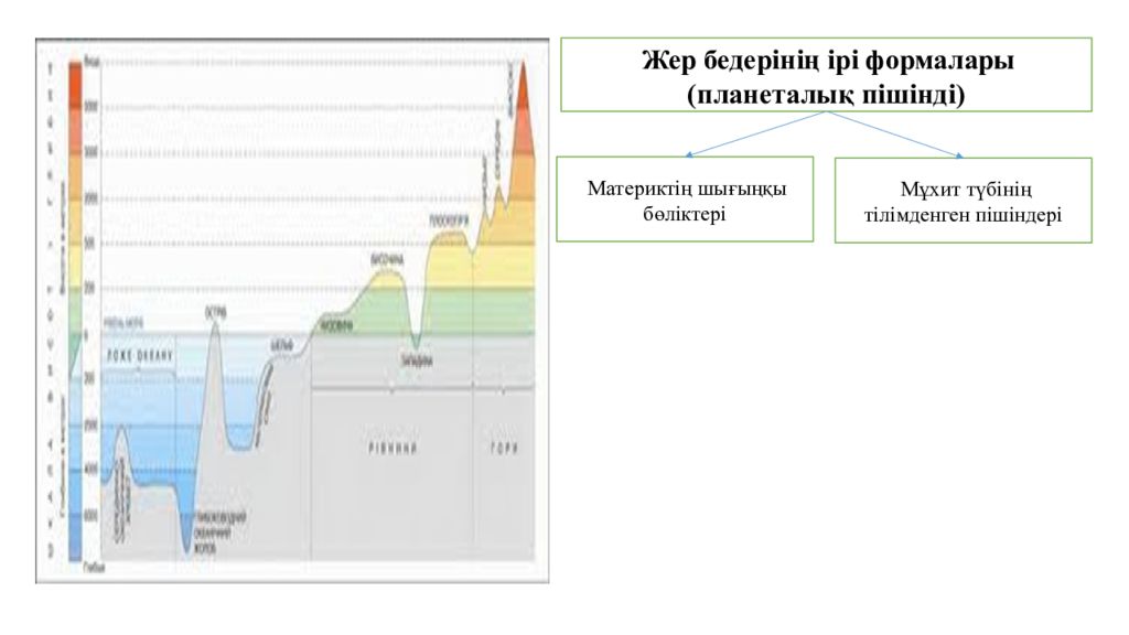 Жер бедерінің ірі формалары ( планеталық пішінді) Материктің шығыңқы бөліктері Мұхит түбінің тілімденген пішіндері