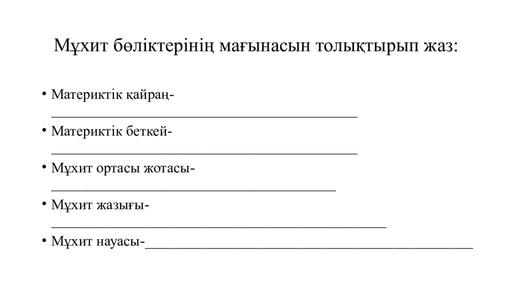 Слайд 10: М ұхит бөліктерінің мағынасын толықтырып жаз: