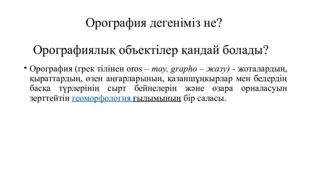 Орография (грек тілінен oros – тау, grapho – жазу ) - жоталардың, қыраттардың, өзен аңғарларының, қазаншұңкырлар мен бедердің басқа түрлерінің сырт бейнелерін және өзара орналасуын зерттейтін геоморфология ғылымының бір саласы. Орографиялық объектілер қандай болады?