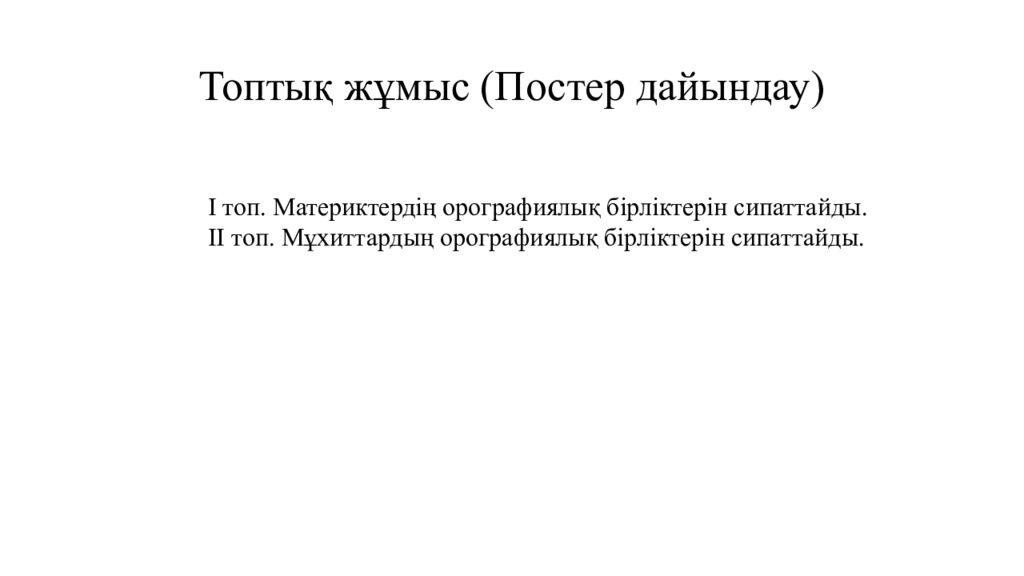 І топ. Материктердің орографиялық бірліктерін сипаттайды. ІІ топ. Мұхиттардың орографиялық бірліктерін сипаттайды.