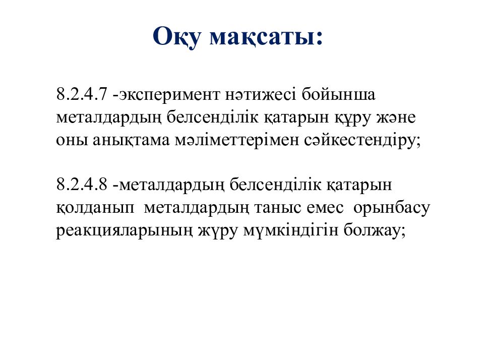 Оқу мақсаты: 8.2.4.7 -эксперимент нәтижесі бойынша металдардың белсенділік қатарын құру және оны анықтама мәліметтерімен сәйкестендіру ; 8.2.4.8 - металдардың белсенділік қатарын қолданып металдардың таныс емес орынбасу реакцияларының жүру мүмкіндігін болжау ;