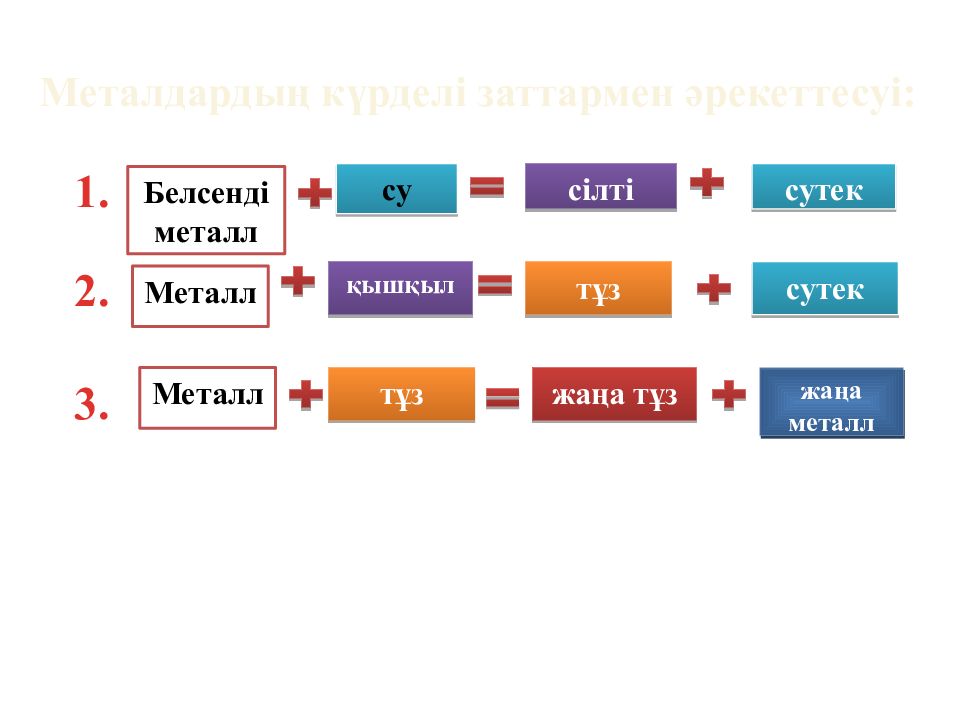 Белсенді металл су сілті сутек Металл қышқыл тұз сутек жаңа металл жаңа тұз 1. 2. 3. Металдардың күрделі заттармен әрекеттесуі: Металл тұз