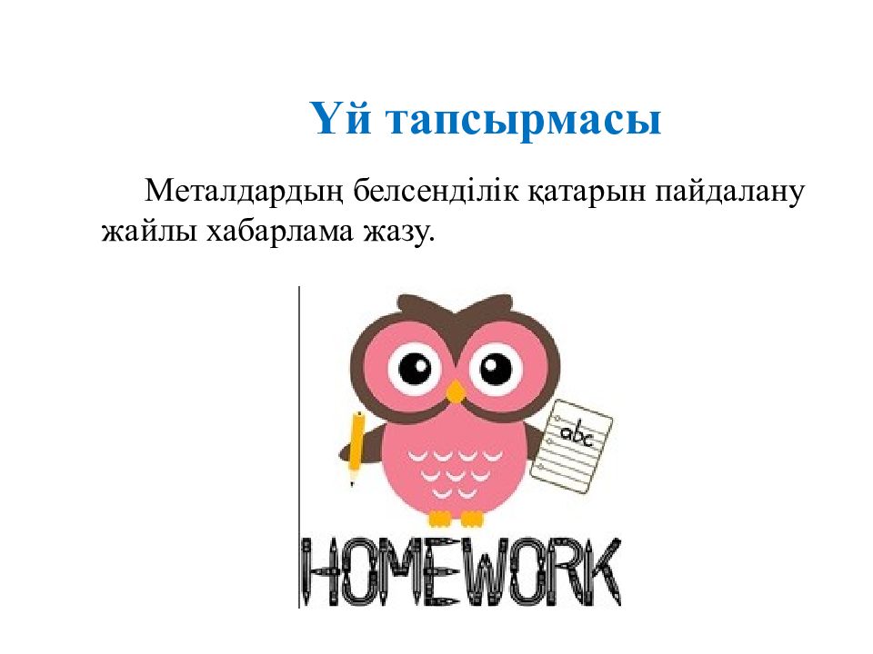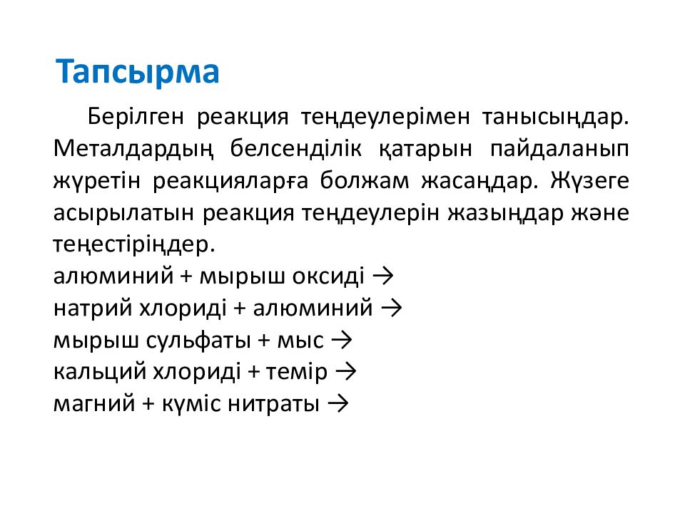 Тапсыр ма Берілген реакция теңдеулерімен танысыңдар. Металдардың белсенділік қатарын пайдаланып жүретін реакцияларға болжам жасаңдар. Жүзеге асырылатын реакция теңдеулерін жазыңдар және теңестіріңдер. алюминий + мырыш оксиді → натрий хлориді + алюминий → мырыш сульфаты + мыс → кальций хлориді + темір → магний + күміс нитраты →