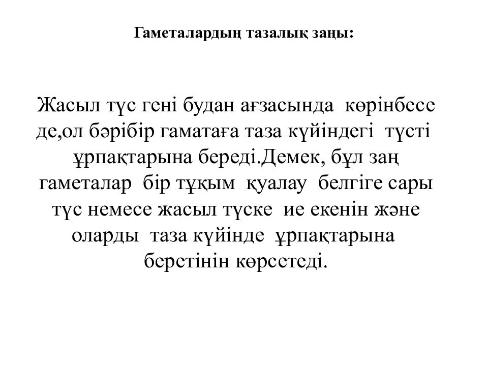 Жасыл түс гені будан ағзасында көрінбесе де,ол бәрібір гаматаға таза күйіндегі түсті ұрпақтарына береді.Демек, бұл заң гаметалар бір тұқым қуалау белгіге сары түс немесе жасыл түске ие екенін және оларды таза күйінде ұрпақтарына беретінін көрсетеді.