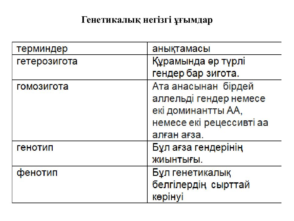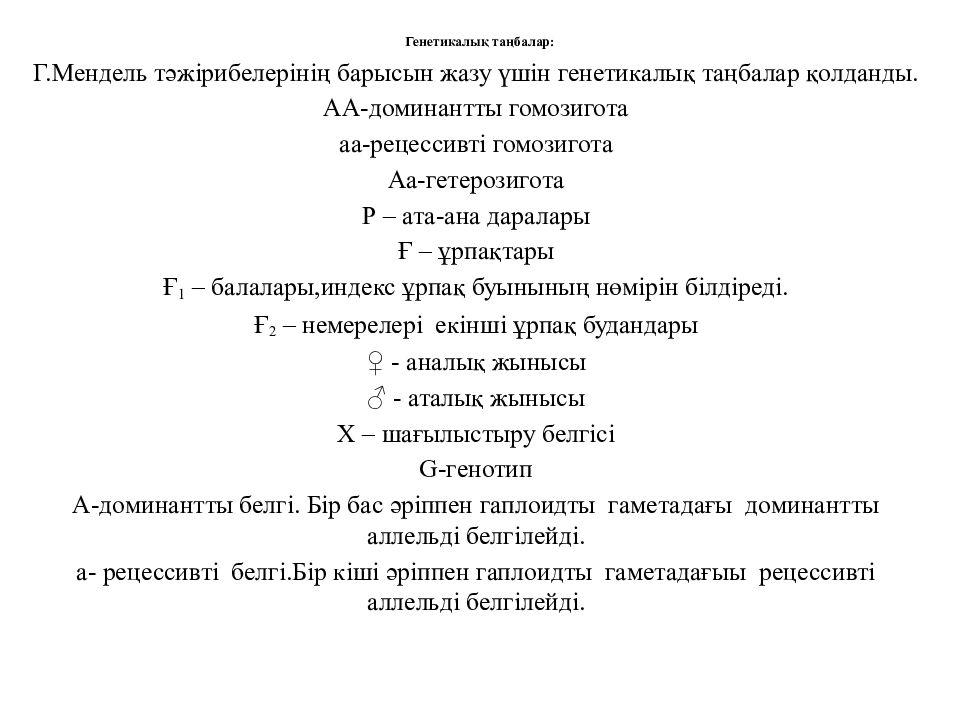 Г.Мендель тәжірибелерінің барысын жазу үшін генетикалық таңбалар қолданды. АА-доминантты гомозигота аа-рецессивті гомозигота Аа-гетерозигота Р – ата-ана даралары Ғ – ұрпақ тары Ғ 1 – балалары,индекс ұрпақ буынының нөмірін білдіреді. Ғ 2 – немерелері екінші ұрпақ будандары ♀ - аналық жынысы ♂ - аталық жынысы Χ – шағылыстыру белгісі G-генотип А-доминантты белгі. Бір бас әріппен гаплоидты гаметадағы доминантты аллельді белгілейді. а- рецессивті белгі.Бір кіші әріппен гаплоидты гаметадағыы рецессивті аллельді белгілейді.