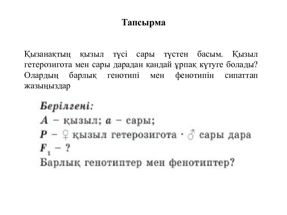 Қызанақтың қызыл түсі сары түстен басым. Қызыл гетерозигота мен сары дарадан қандай ұрпақ күтуге болады? Олардың барлық генотипі мен фенотипін сипаттап жазыңыздар