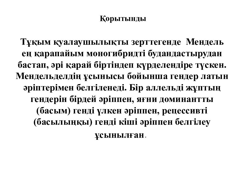Последний слайд презентации: Сабақтың тақырыбы : Тұқымқуалаушылық заңдылықтарының цитологиялық негіздері: Қорытынды