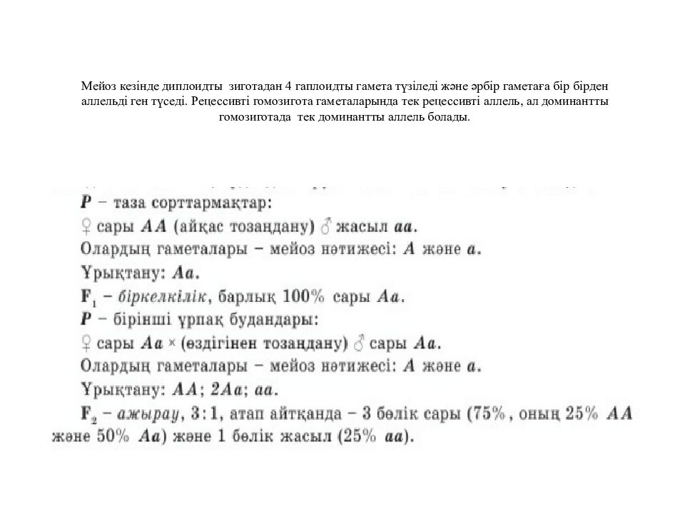 Мейоз кезінде диплоидты зиготадан 4 гаплоидты гамета түзіледі және әрбір гаметаға бір бірден аллельді ген түседі. Рецессивті гомозигота гаметаларында тек рецессивті аллель, ал доминантты гомозиготада тек доминантты аллель болады.