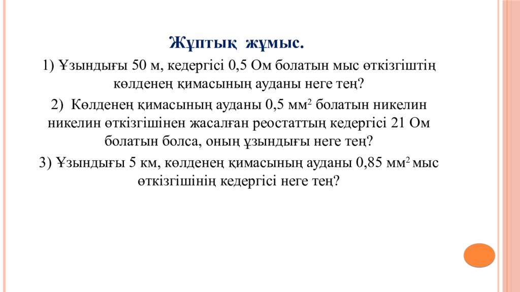 Жұптық жұмыс. 1) Ұзындығы 50 м, кедергісі 0,5 Ом болатын мыс өткізгіштің көлденең қимасының ауданы неге тең? 2) Көлденең қимасының ауданы 0,5 мм 2 болатын никелин никелин өткізгішінен жасалған реостаттың кедергісі 21 Ом болатын болса, оның ұзындығы неге тең? 3) Ұзындығы 5 км, көлденең қимасының ауданы 0,85 мм 2 мыс өткізгішінің кедергісі неге тең?