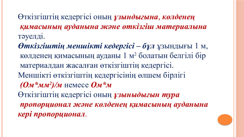 Өткізгіштіӊ кедергісі оныӊ ұзындығына, көлденеӊ қимасыныӊ ауданына және өткізгіш материалына тәуелді. Өткізгіштіӊ меншікті кедергісі – бұл ұзындығы 1 м, көлденеӊ қимасыныӊ ауданы 1 м 2 болатын белгілі бір материалдан жасалған өткізгіштіӊ кедергісі. Меншікті өткізгіштіӊ кедергісініӊ өлшем бірлігі (Ом*мм 2 )/м немесе Ом*м Өткізгіштіӊ кедергісі оныӊ ұзыныдығын тура пропорционал және көлденеӊ қимасыныӊ ауданына кері пропорционал.