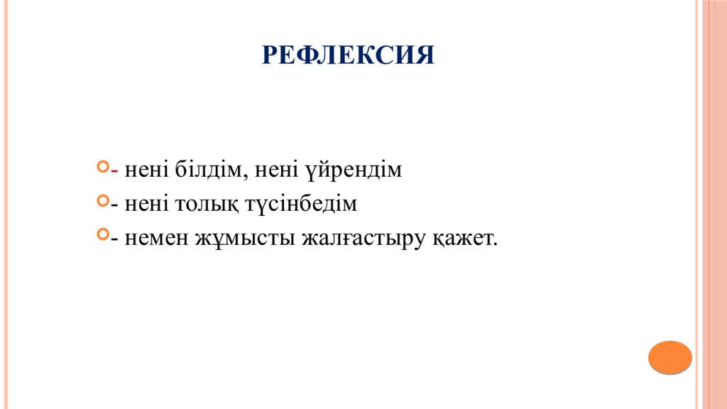 - нені білдім, нені үйрендім - нені толық түсінбедім - немен жұмысты жалғастыру қажет.