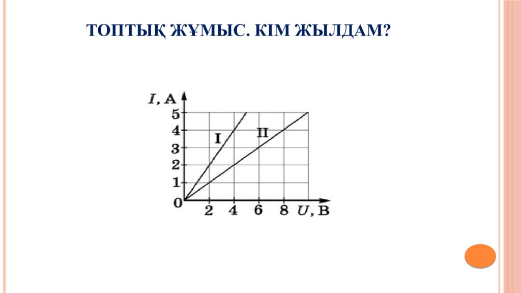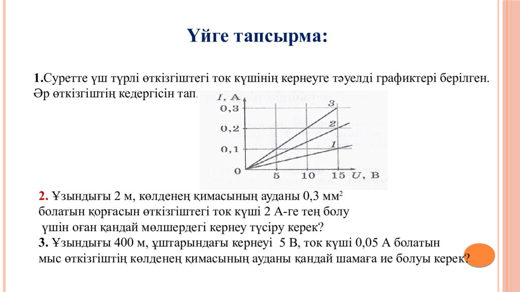 Үйге тапсырма: 1. Суретте үш түрлі өткізгіштегі ток күшінің кернеуге тәуелді графиктері берілген. Әр өткізгіштің кедергісін тап. 2. Ұзындығы 2 м, көлденең қимасының ауданы 0,3 мм 2 болатын қорғасын өткізгіштегі ток күші 2 А-ге тең болу үшін оған қандай мөлшердегі кернеу түсіру керек? 3. Ұзындығы 400 м, ұштарындағы кернеуі 5 В, ток күші 0,05 А болатын мыс өткізгіштің көлденең қимасының ауданы қандай шамаға ие болуы керек?