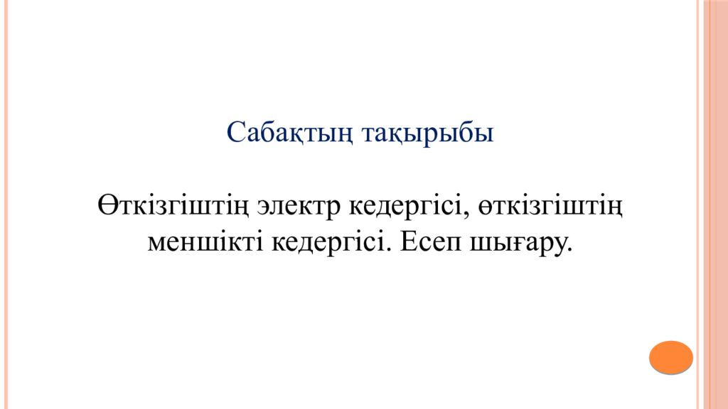 Последний слайд презентации: Сабақтың тақырыбы Өткiзгiштiң электр кедергiсi, өткiзгiштiң меншiктi кедергiсi