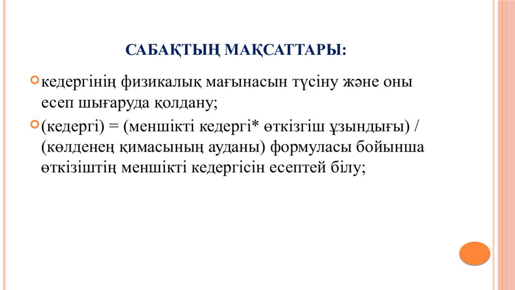 кедергініӊ физикалық мағынасын түсіну және оны есеп шығаруда қолдану; (кедергі) = (меншікті кедергі* өткізгіш ұзындығы) / (көлденеӊ қимасыныӊ ауданы) формуласы бойынша өткізіштіӊ меншікті кедергісін есептей білу;