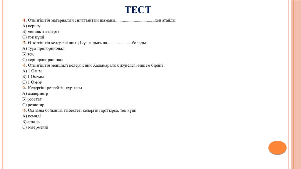 1. Өткізгіштің материалын сипаттайтын шаманы....................................деп атайды. А) кернеу Б) меншікті кедергі С) ток күші 2. Өткізгіштің кедергісі оның L ұзындығына.......................болады. А) тура пропорционал Б) тең С) кері пропорционал 3. Өткізгіштің меншікті кедергісінің Халықаралық жүйедегі өлшем бірлігі: А) 1 Ом⋅м Б) 1 Ом⋅мм С) 1 Ом/м 2 4. Кедергіні реттейтін құрылғы А) амперметр Б) реостат С) резистор 5. Ом заңы бойынша тізбектегі кедергіні арттырса, ток күші А) кемиді Б) артады С) өзгермейді