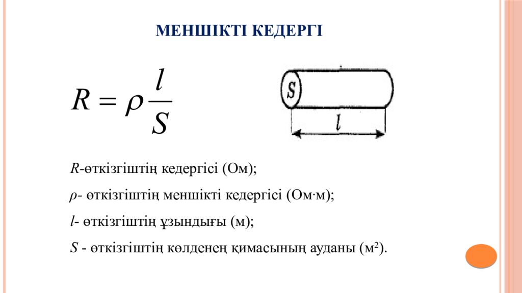 R - өткізгішті ӊ кедергісі ( O м); ρ- өткізгіштің меншікті кедергісі ( O м∙м ); l - өткізгіштің ұзындығы (м); S - өткізгіштің көлденең қимасының ауданы (м 2 ).