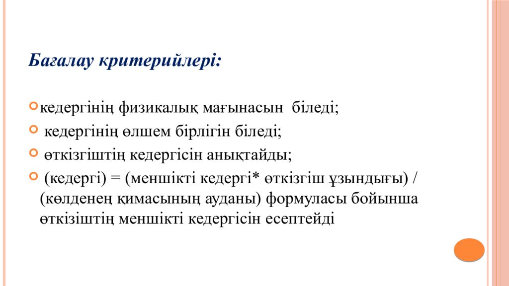 Бағалау критерийлері: кедергініӊ физикалық мағынасын біледі; кедергініӊ өлшем бірлігін біледі; өткізгіштіӊ кедергісін анықтайды; (кедергі) = (меншікті кедергі* өткізгіш ұзындығы) / (көлденеӊ қимасыныӊ ауданы) формуласы бойынша өткізіштіӊ меншікті кедергісін есептейді