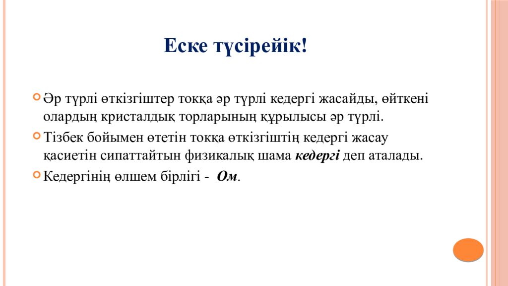 Еске түсірейік! Әр түрлі өткізгіштер токқа әр түрлі кедергі жасайды, өйткені олардыӊ кристалдық торларыныӊ құрылысы әр түрлі. Тізбек бойымен өтетін токқа өткізгіштіӊ кедергі жасау қасиетін сипаттайтын физикалық шама кедергі деп аталады. Кедергініӊ өлшем бірлігі - Ом.