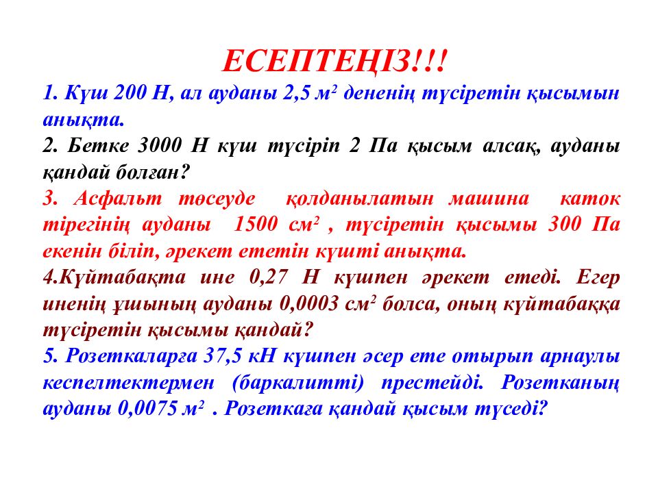 ЕСЕПТЕҢІЗ!!! 1. Күш 200 Н, ал ауданы 2,5 м 2 дененің түсіретін қысымын анықта. 2. Бетке 3000 Н күш түсіріп 2 Па қысым алсақ, ауданы қандай болған? 3. Асфальт төсеуде қолданылатын машина каток тірегінің ауданы 1500 см 2, түсіретін қысымы 300 Па екенін біліп, әрекет ететін күшті анықта. 4.Күйтабақта ине 0,27 Н күшпен әрекет етеді. Егер иненің ұшының ауданы 0,0003 см 2 болса, оның күйтабаққа түсіретін қысымы қандай? 5. Розеткаларға 37,5 кН күшпен әсер ете отырып арнаулы кеспелтектермен (баркалитті) престейді. Розетканың ауданы 0,0075 м 2. Розеткаға қандай қысым түседі?