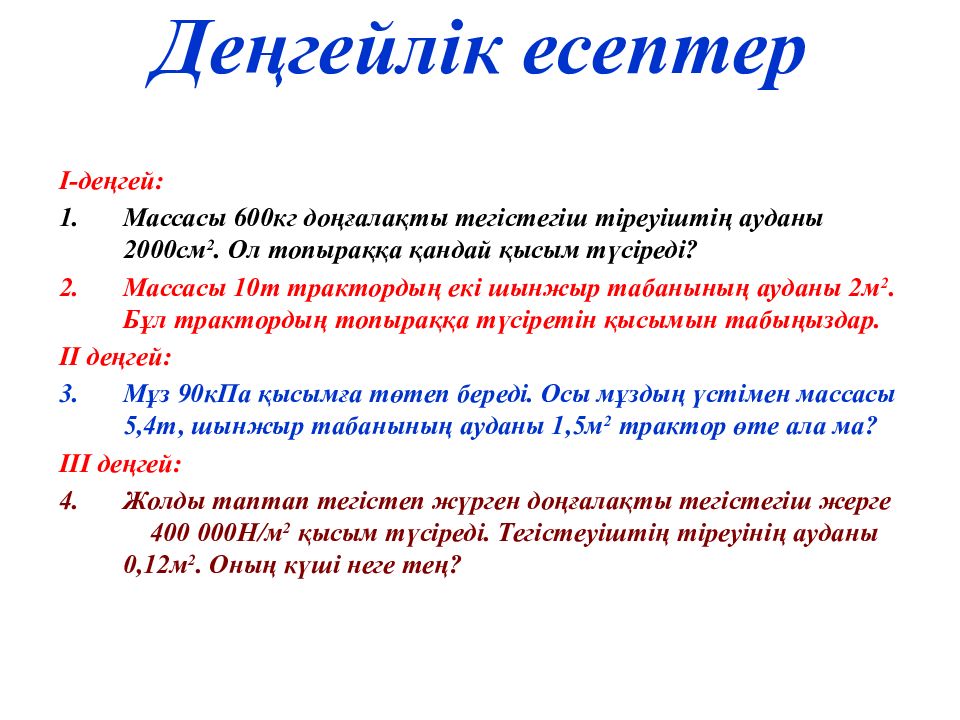 І-деңгей: Массасы 600кг доңғалақты тегістегіш тіреуіштің ауданы 2000см 2. Ол топыраққа қандай қысым түсіреді? Массасы 10т трактордың екі шынжыр табанының ауданы 2м 2. Бұл трактордың топыраққа түсіретін қысымын табыңыздар. ІІ деңгей: Мұз 90кПа қысымға төтеп береді. Осы мұздың үстімен массасы 5,4т, шынжыр табанының ауданы 1,5м 2 трактор өте ала ма? ІІІ деңгей: Жолды таптап тегістеп жүрген доңғалақты тегістегіш жерге 400 000Н/м 2 қысым түсіреді. Тегістеуіштің тіреуінің ауданы 0,12м 2. Оның күші неге тең?