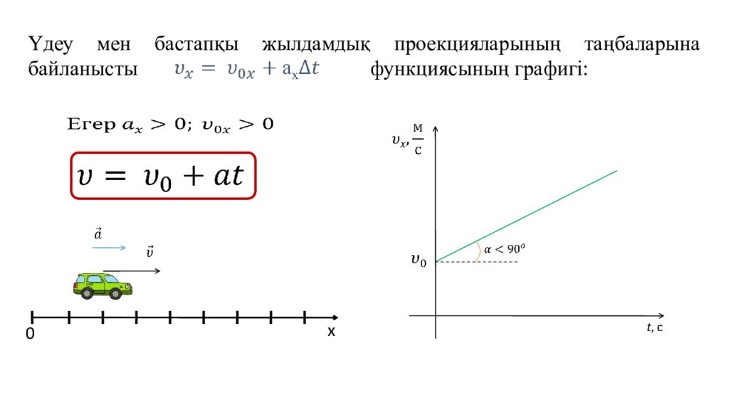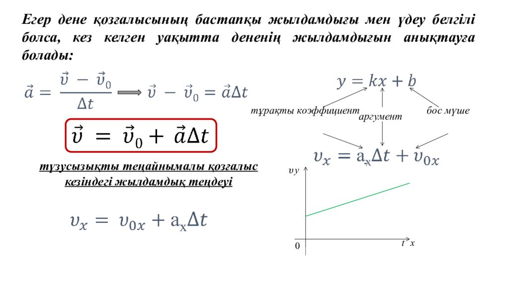 Егер дене қозғалысының бастапқы жылдамдығы мен үдеу белгілі болса, кез келген уақытта дененің жылдамдығын анықтауға болады: түзусызықты теңайнымалы қозғалыс кезіндегі жылдамдық теңдеуі аргумент тұрақты коэффициент бос мүше y x 0 t