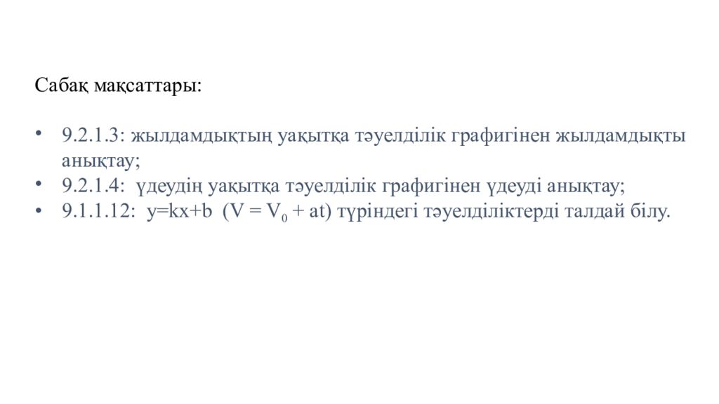 Сабақ мақсаттары: 9.2.1.3: жылдамдықтың уақытқа тәуелділік графигінен жылдамдықты анықтау; 9.2.1.4: үдеудің уақытқа тәуелділік графигінен үдеуді анықтау; 9.1.1.12: y=kx+b (V = V 0 + at) түріндегі тәуелділіктерді талдай білу.