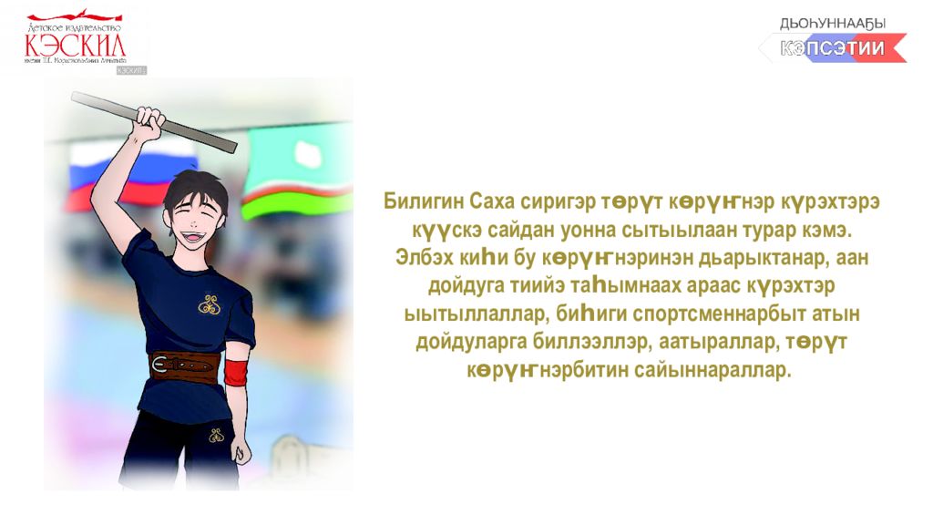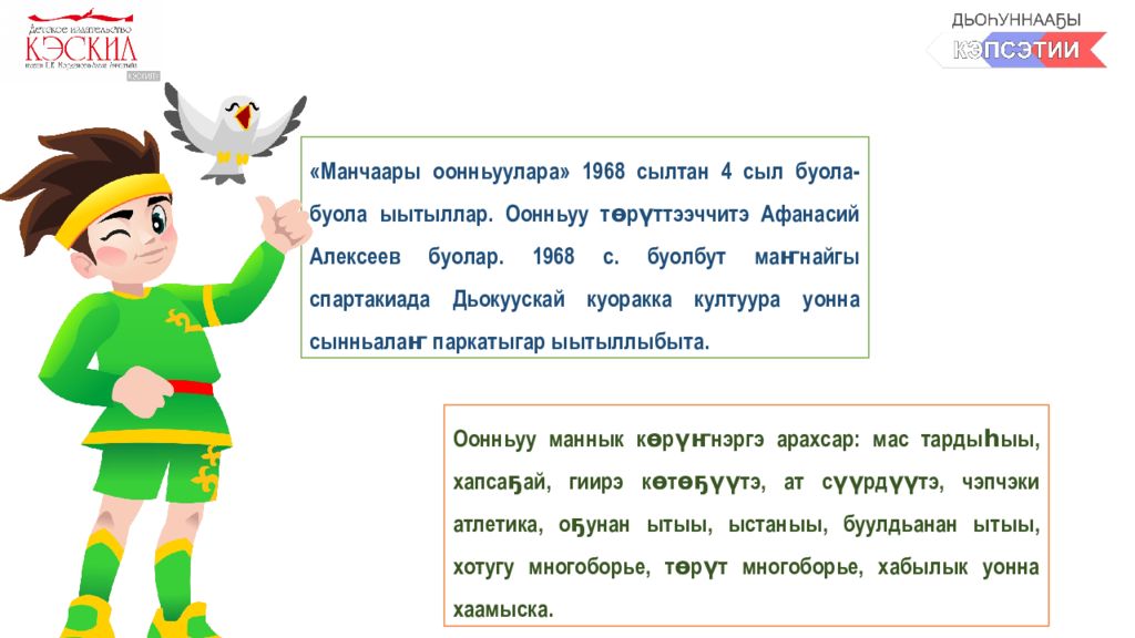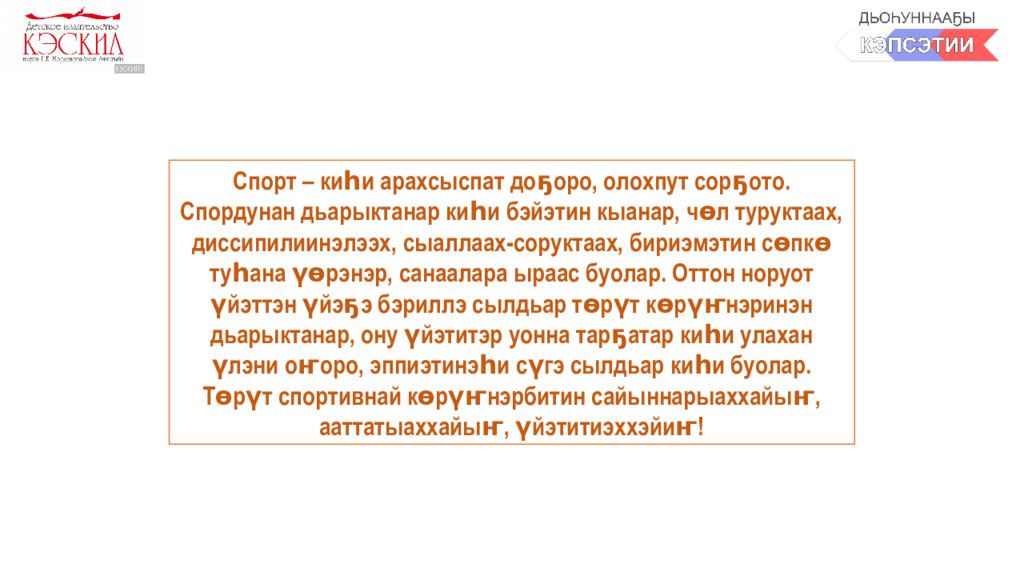 Спорт – киһи арахсыспат доҕоро, олохпут сорҕото. Спордунан дьарыктанар киһи бэйэтин кыанар, чөл туруктаах, диссипилиинэлээх, сыаллаах-соруктаах, бириэмэтин сөпкө туһана үөрэнэр, санаалара ыраас буолар. Оттон норуот үйэттэн үйэҕэ бэриллэ сылдьар төрүт көрүҥнэринэн дьарыктанар, ону үйэтитэр уонна тарҕатар киһи улахан үлэни оҥоро, эппиэтинэһи сүгэ сылдьар киһи буолар. Төрүт спортивнай көрүҥнэрбитин сайыннарыаххайыҥ, ааттатыаххайыҥ, үйэтитиэххэйиҥ!