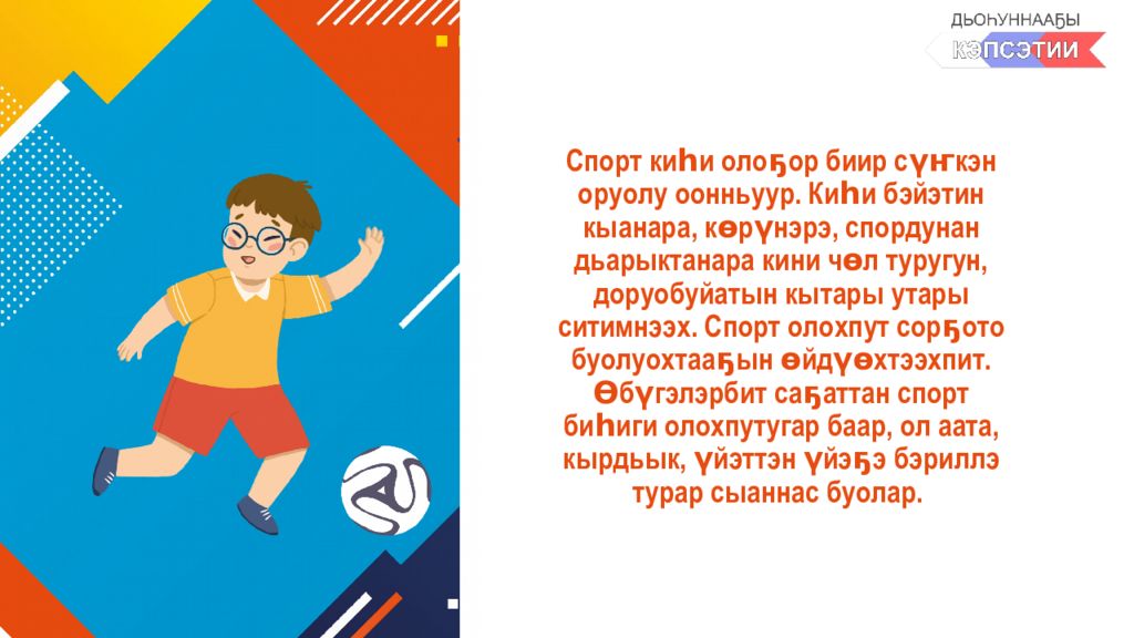 Спорт киһи олоҕор биир сүҥкэн оруолу оонньуур. Киһи бэйэтин кыанара, көрүнэрэ, спордунан дьарыктанара кини чөл туругун, доруобуйатын кытары утары ситимнээх. Спорт олохпут сорҕото буолуохтааҕын өйдүөхтээхпит. Өбүгэлэрбит саҕаттан спорт биһиги олохпутугар баар, ол аата, кырдьык, үйэттэн үйэҕэ бэриллэ турар сыаннас буолар.
