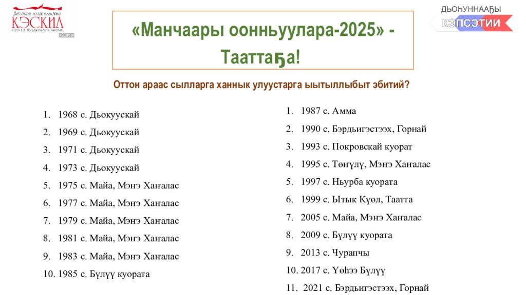 « Манчаары оонньуулара-2025 » - Тааттаҕа! Оттон араас сылларга ханнык улуустарга ыытыллыбыт эбитий? 1968 с. Дьокуускай 1969 с. Дьокуускай 1971 с. Дьокуускай 1973 с. Дьокуускай 1975 с. Майа, Мэҥэ Хаҥалас 1977 с. Майа, Мэҥэ Хаҥалас 1979 с. Майа, Мэҥэ Хаҥалас 1981 с. Майа, Мэҥэ Хаҥалас 1983 с. Майа, Мэҥэ Хаҥалас 1985 с. Бүлүү куората 1987 с. Амма 1990 с. Бэрдьигэстээх, Горнай 1993 с. Покровскай куорат 1995 с. Төҥүлү, Мэҥэ Хаҥалас 1997 с. Ньурба куората 1999 с. Ытык Күөл, Таатта 2005 с. Майа, Мэҥэ Хаҥалас 2009 с. Бүлүү куората 2013 с. Чурапчы 2017 с. Үөһээ Бүлүү 2021 с. Бэрдьигэстээх, Горнай