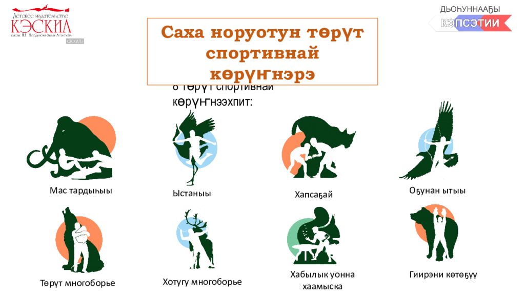 8 төрүт спортивнай көрүҥнээхпит: Саха норуотун төрүт спортивнай көрүҥнэрэ Мас тардыһыы Ыстаныы Хапсаҕай Оҕунан ытыы Төрүт многоборье Хотугу многоборье Хабылык уонна хаамыска Гиирэни көтөҕүү