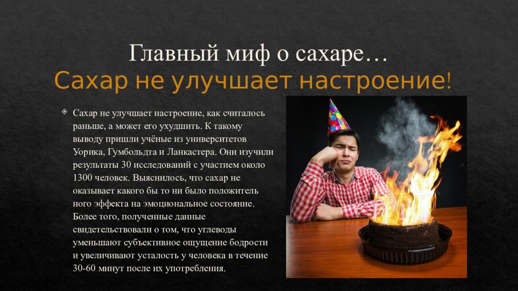 Сахар не улучшает настроение, как считалось раньше, а может его ухудшить. К такому выводу пришли учёные из университетов Уорика, Гумбольдта и Ланкастера. Они изучили результаты 30 исследований с участием около 1300 человек. Выяснилось, что сахар не оказывает какого бы то ни было положительного эффекта на эмоциональное состояние. Более того, полученные данные свидетельствовали о том, что углеводы уменьшают субъективное ощущение бодрости и увеличивают усталость у человека в течение 30-60 минут после их употребления. 28.05.2020 Сахар не улучшает настроение!