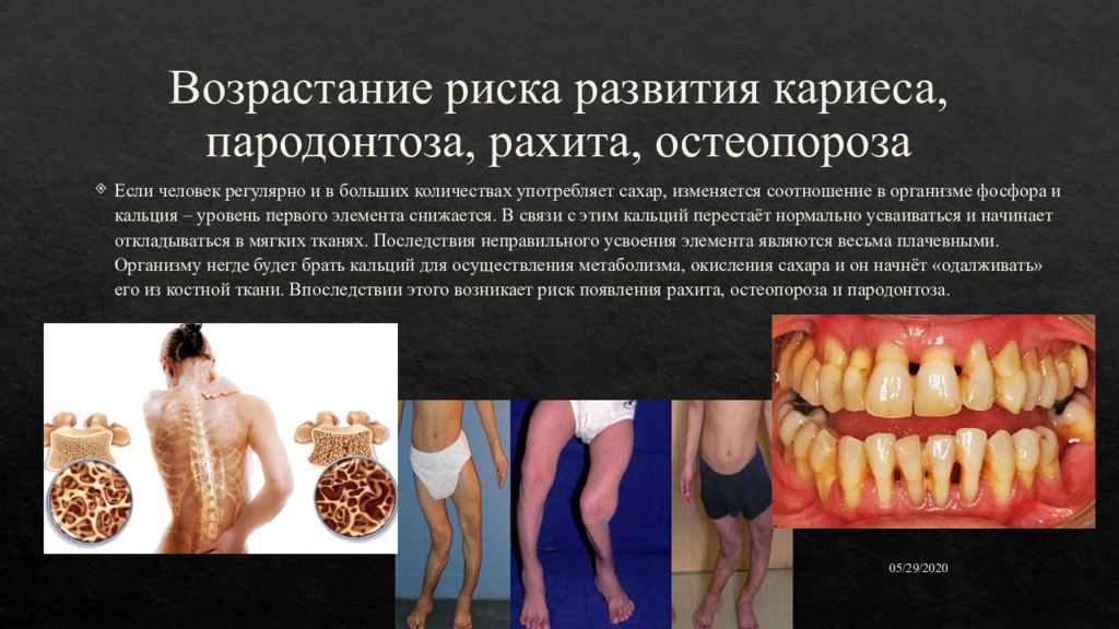 Если человек регулярно и в больших количествах употребляет сахар, изменяется соотношение в организме фосфора и кальция – уровень первого элемента снижается. В связи с этим кальций перестаёт нормально усваиваться и начинает откладываться в мягких тканях. Последствия неправильного усвоения элемента являются весьма плачевными. Организму негде будет брать кальций для осуществления метаболизма, окисления сахара и он начнёт «одалживать» его из костной ткани. Впоследствии этого возникает риск появления рахита, остеопороза и пародонтоза. 28.05.2020