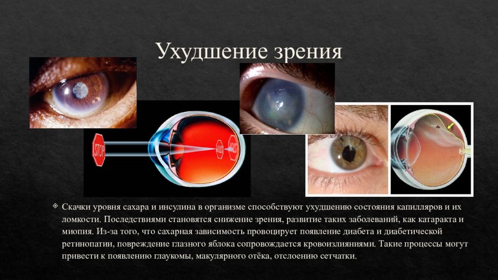 Скачки уровня сахара и инсулина в организме способствуют ухудшению состояния капилляров и их ломкости. Последствиями становятся снижение зрения, развитие таких заболеваний, как катаракта и миопия. Из-за того, что сахарная зависимость провоцирует появление диабета и диабетической ретинопатии, повреждение глазного яблока сопровождается кровоизлияниями. Такие процессы могут привести к появлению глаукомы, макулярного отёка, отслоению сетчатки.