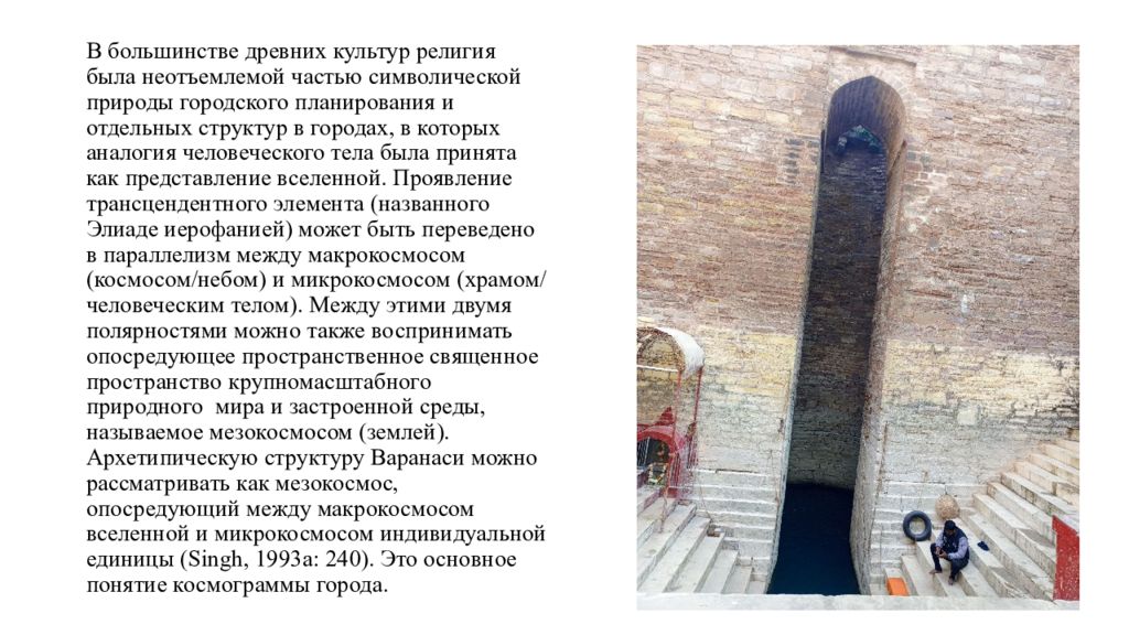 В большинстве древних культур религия была неотъемлемой частью символической природы городского планирования и отдельных структур в городах, в которых аналогия человеческого тела была принята как представление вселенной. Проявление трансцендентного элемента (названного Элиаде иерофанией ) может быть переведено в параллелизм между макрокосмосом (космосом/небом) и микрокосмосом (храмом/человеческим телом). Между этими двумя полярностями можно также воспринимать опосредующее пространственное священное пространство крупномасштабного природного мира и застроенной среды, называемое мезокосмосом (землей). Архетипическую структуру Варанаси можно рассматривать как мезокосмос, опосредующий между макрокосмосом вселенной и микрокосмосом индивидуальной единицы ( Singh, 1993a: 240). Это основное понятие космограммы города.