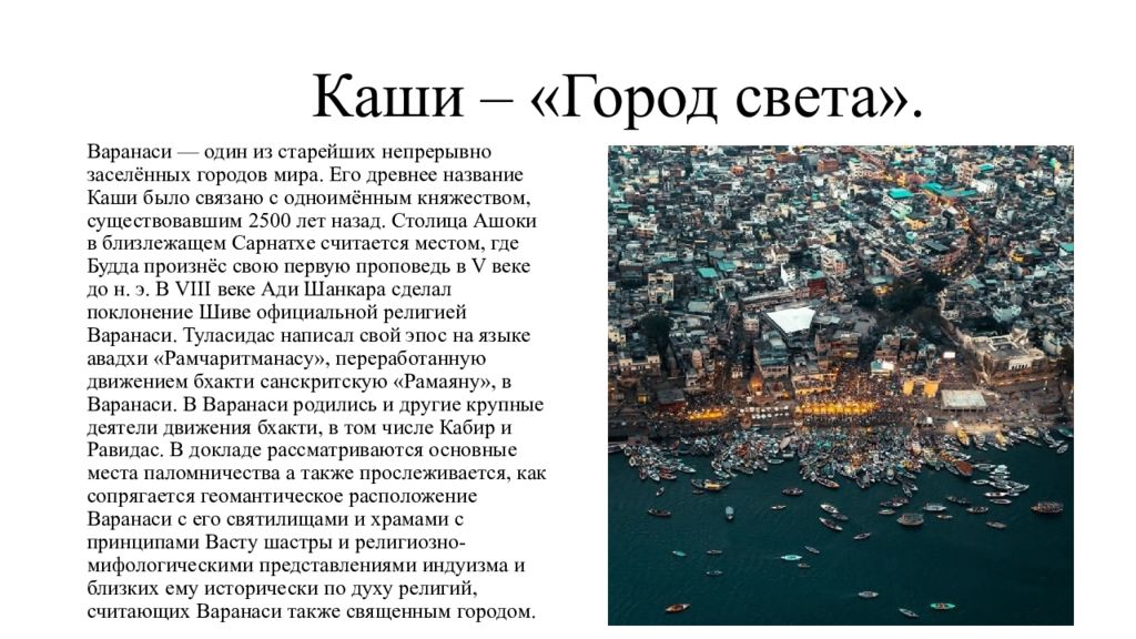 Варанаси — один из старейших непрерывно заселённых городов мира. Его древнее название Каши было связано с одноимённым княжеством, существовавшим 2500 лет назад. С толица Ашоки в близлежащем Сарнатхе считается местом, где Будда произнёс свою первую проповедь в V веке до н. э. В VIII веке Ади Шанкара сделал поклонение Шиве официальной религией Варанаси. Туласидас написал свой эпос на языке авадхи « Рамчаритманасу », переработанную движением бхакти санскритскую «Рамаяну», в Варанаси. В Варанаси родились и другие крупные деятели движения бхакти, в том числе Кабир и Равидас. В докладе рассматриваются основные места паломничества а также прослеживается, как сопрягается геомантическое расположение Варанаси с его святил и щами и храмами с принципами Васту шастры и религиозно-мифологическими представлениями индуизма и близких ему исторически по духу религий, считающих Варанаси также священным городом.