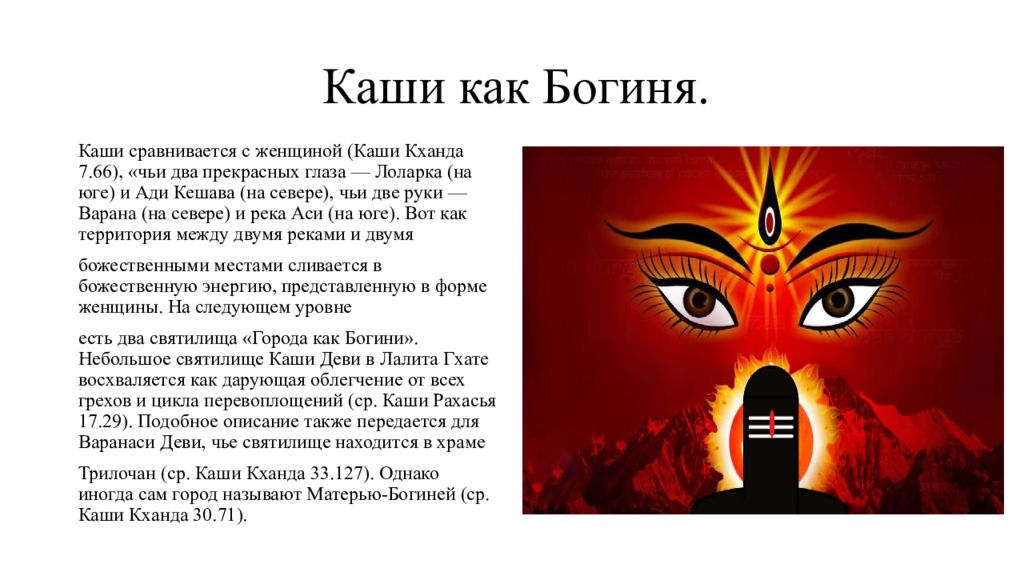 Каши сравнивается с женщиной (Каши Кханда 7.66), «чьи два прекрасных глаза — Лоларка (на юге) и Ади Кешава (на севере), чьи две руки — Варана (на севере) и река Аси (на юге). Вот как территория между двумя реками и двумя божественными местами сливается в божественную энергию, представленную в форме женщины. На следующем уровне есть два святилища «Города как Богини». Небольшое святилище Каши Деви в Лалита Гхате восхваляется как дарующая облегчение от всех грехов и цикла перевоплощений (ср. Каши Рахасья 17.29). Подобное описание также передается для Варанаси Деви, чье святилище находится в храме Трилочан (ср. Каши Кханда 33.127). Однако иногда сам город называют Матерью-Богиней (ср. Каши Кханда 30.71).