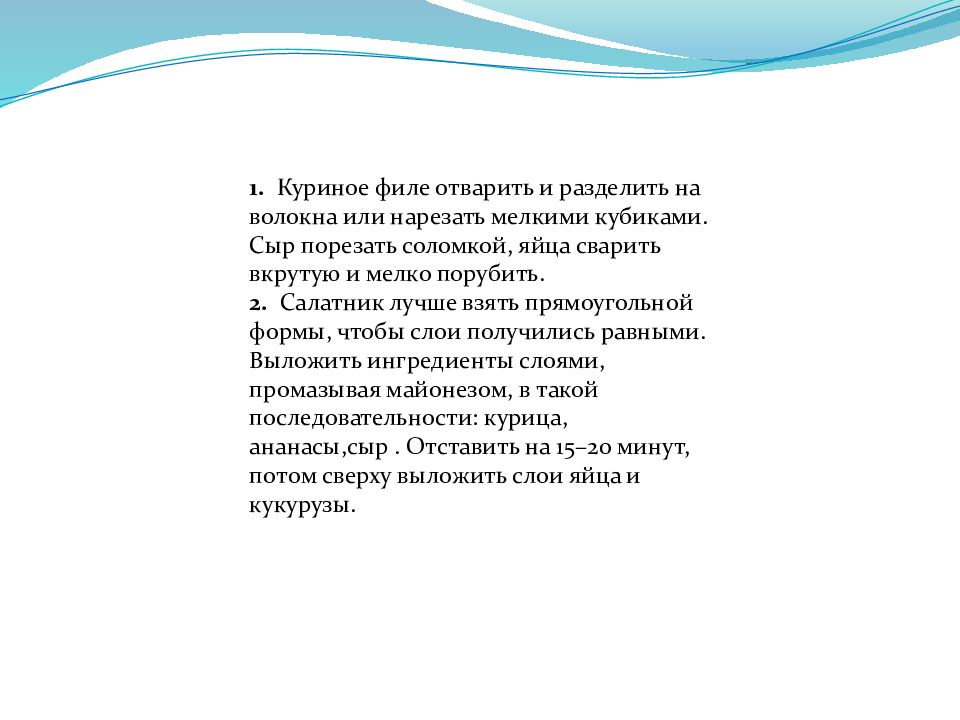 1. Куриное филе отварить и разделить на волокна или нарезать мелкими кубиками. Сыр порезать соломкой, яйца сварить вкрутую и мелко порубить. 2. Салатник лучше взять прямоугольной формы, чтобы слои получились равными. Выложить ингредиенты слоями, промазывая майонезом, в такой последовательности: курица, ананасы,сыр. Отставить на 15–20 минут, потом сверху выложить слои яйца и кукурузы.