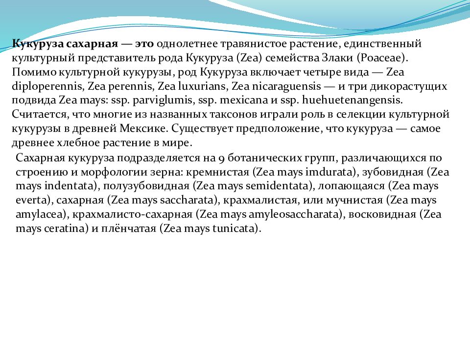 Кукуруза сахарная — это однолетнее травянистое растение, единственный культурный представитель рода Кукуруза ( Zea ) семейства Злаки ( Poaceae ). Помимо культурной кукурузы, род Кукуруза включает четыре вида — Zea diploperennis, Zea perennis, Zea luxurians, Zea nicaraguensis — и три дикорастущих подвида Zea mays : ssp. parviglumis, ssp. mexicana и ssp. huehuetenangensis. Считается, что многие из названных таксонов играли роль в селекции культурной кукурузы в древней Мексике. Существует предположение, что кукуруза — самое древнее хлебное растение в мире. Сахарная кукуруза подразделяется на 9 ботанических групп, различающихся по строению и морфологии зерна: кремнистая ( Zea mays imdurata ), зубовидная ( Zea mays indentata ), полузубовидная ( Zea mays semidentata ), лопающаяся ( Zea mays everta ), сахарная ( Zea mays saccharata ), крахмалистая, или мучнистая ( Zea mays amylacea ), крахмалисто-сахарная ( Zea mays amyleosaccharata ), восковидная ( Zea mays ceratina ) и плёнчатая ( Zea mays tunicata ).